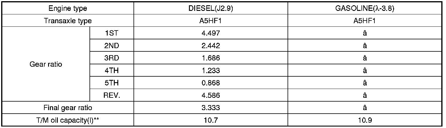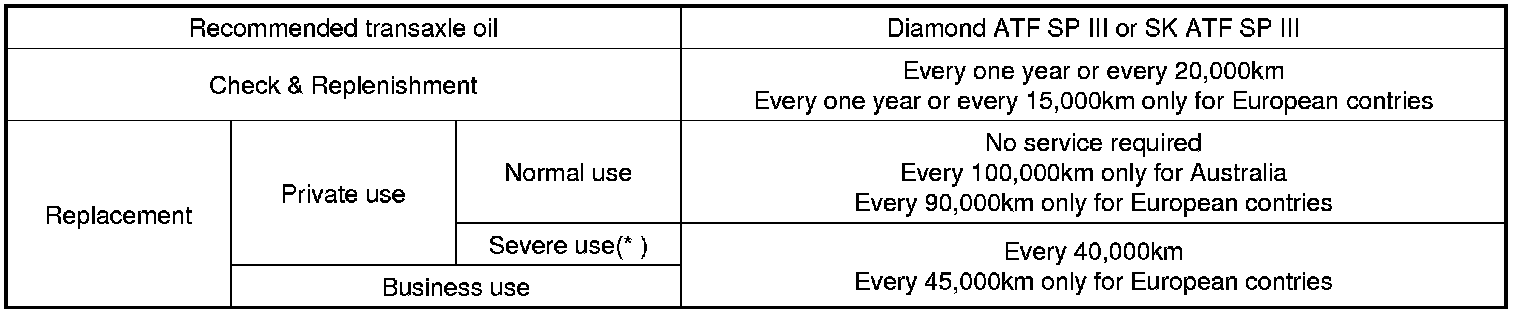 ** The quantity in the chart above is for the reference. The actual filling quantity of the automatic transaxle fluid must be set according to 'INSPECTION' or 'REPLACEMENT' procedure of the automatic transaxle fluid.