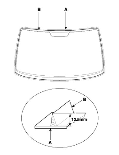 8. Pack adhesive into the cartridge without air pockets to ensure continuous delivery. Put the cartridge in a caulking gun, and run a bead of adhesive (A) around the edge of the windshield (B) between the fastener and molding as shown. Apply the adhesive within 30 minutes after applying the glass primer.