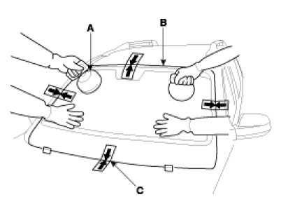 3. Install the windshield (A) upper molding (B) and fasteners (C). Do not allow any gaps.