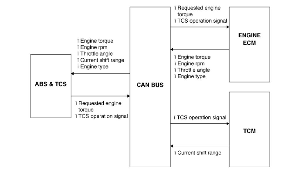 4. HECU will transmit engine torque reduction request, fuel cut cylinder number, and TCS control request signals in accordance with slip level to engine ECM and TCM through BUS line which will provide CAN communication for TCS control.