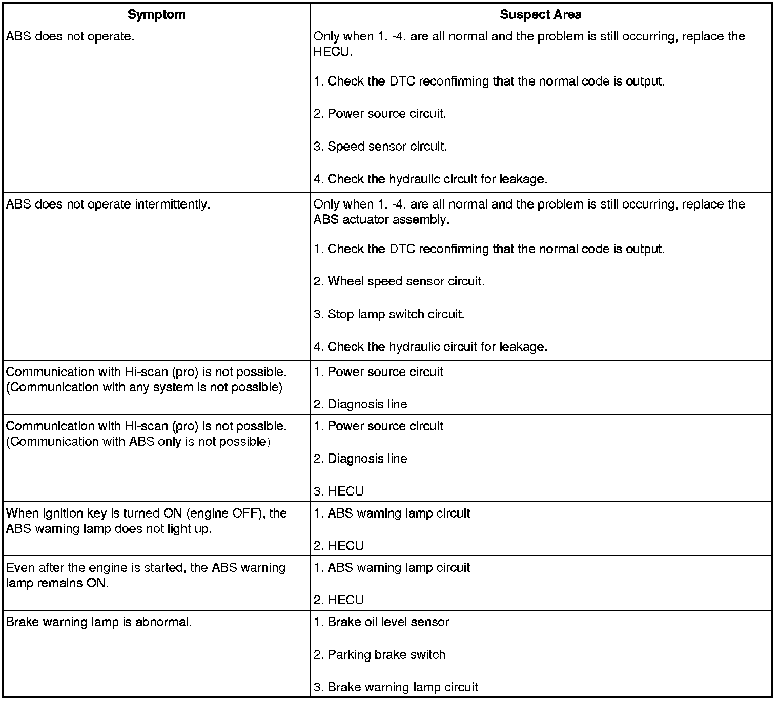 If a normal code is displayed during the DTC check but the problem still occurs, check the circuits for each problem symptom in the order given in the table below and proceed to the relevant troubleshooting page.