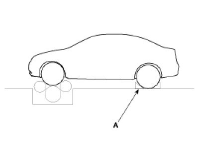 2. Drive the vehicle onto a speedometer tester. Use wheel chocks(A) as appropriate.