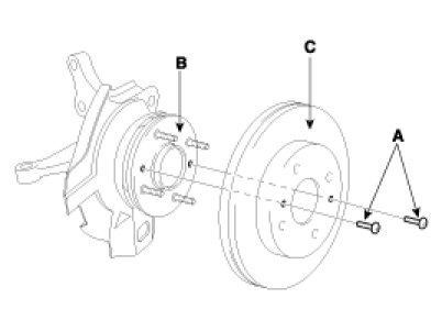 1. After removing the fixed screws(A) mounting the brake disc(C), remove the brake disc(C) from the hub(B).