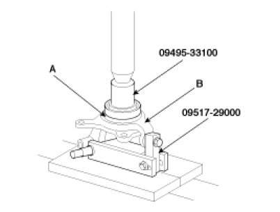 7. Using the special tools (09495-33100, 09517-29000), remove the wheel bearing outer race(A)from the knuckle(B).