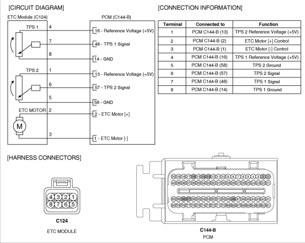ETC (Electronic Throttle Control) system is electronically controlled throttle device which controls the throttle valve. It consists of ETC motor, throttle body and throttle position sensor (TPS). A mechanical throttle control system receives a driver's intention via a wire cable between the accelerator and the throttle valve, while this ETC system does the signal from the Accelerator Position Sensor (APS) installed on the accelerator pedal. After the PCM receives the APS signal and calculates the throttle opening angle, it activates the throttle valve by using the ETC motor. Additionally, it can materialize cruise control function without any special devices.