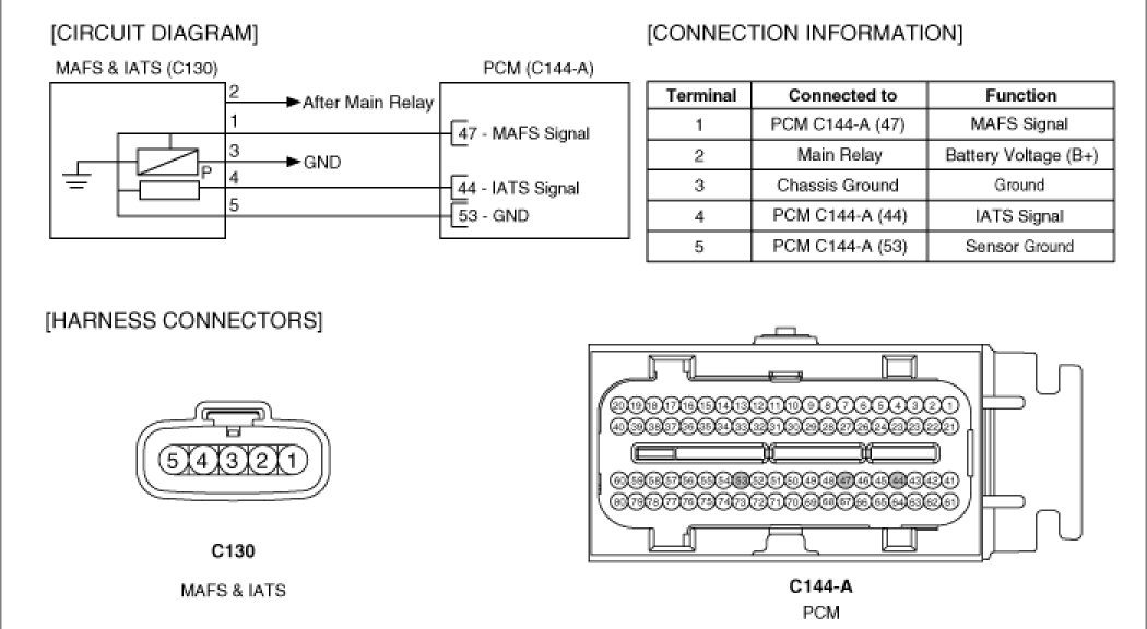 Intake Air Temperature Sensor (IATS) is installed inside the Mass Air Flow Sensor (MAFS) and detects the intake air temperature. To calculate precise air quantity, correction of the air temperature is needed because air density varies according to the temperature. So the PCM uses not only MAFS signal but also IATS signal. This sensor has a Negative Temperature Coefficient (NTC) and its resistance is in inverse proportion to the temperature.
