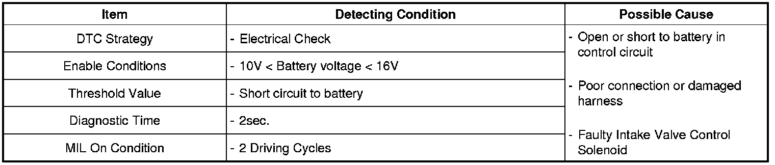 The CVVT (Continuously Variable Valve Timing) system built on the camshaft helps the engine decrease the exhaust gas and increase engine power and fuel economy by changing the valve open/close timing of the intake camshaft continuously. The intake valve control solenoid, the main control part of the CVVT, changes the direction of the oil path through the CVVT by the duty control of the ECM and changes the open and close timing of the intake and exhaust valves.
