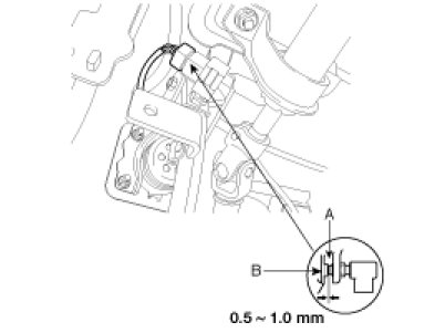 Screw in the brake switch until its plunger is fully depressed (threaded end (A) touching the pad (B) on the pedal arm) then brake off the switch 3/4 turn to make 0.5 - 1.0 mm (0.0197 - 0.0394 in.) of clearance between the brake switch connector. Make sure that the brake lights go off when the pedal is released.