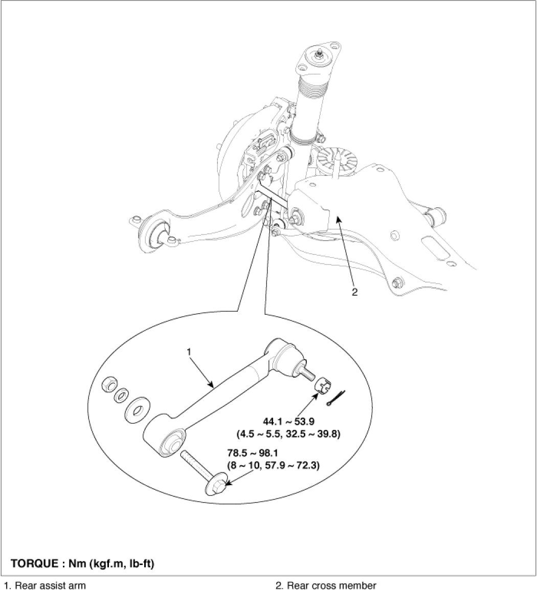 1. Install the rear assist arm (A) mounting nut (B) to the cross member.