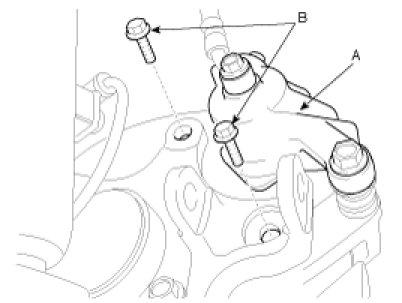 3. Install the brake caliper assembly (A) mounting bolts (B).