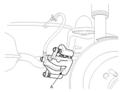 3. Remove the brake caliper mounting bolts (B), and then place the brake caliper assembly (A) with wire as shown in the illustration.