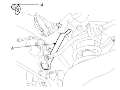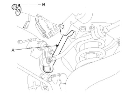 6. Remove the rear assist arm (A) mounting nut (B) from the cross member.