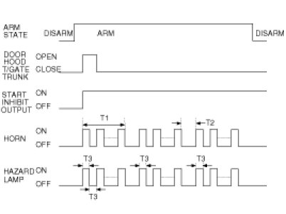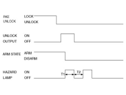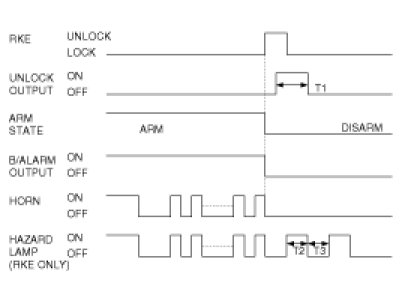 (1) ARM state is released (DISARM state) and the horn, the hazard output and the B/Alarm output shall be OFF, and the unlock output shall be ON for T1, and hazard lamp output shall be ON twice with cycle of T2(RKE only).