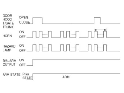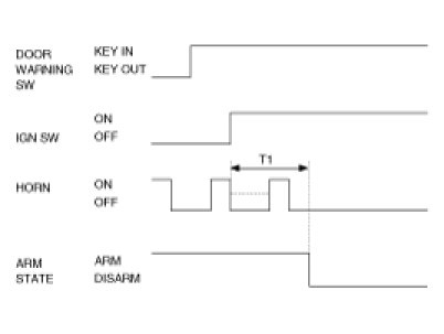 (1) During alarm sequence, if the opened door is open and the Lock signal is received from RKE or Dr/As door, tail gate key lock switch : The horn alarm output, the hazard lamp output and the B/Alarm output shall be OFF and, the Lock output shall be ON for T1 and then, if the opened door is closed actuator lock shall be checked, the hazard lamp output shall be ON once(RKE only) and, it shall be in the ARM state.