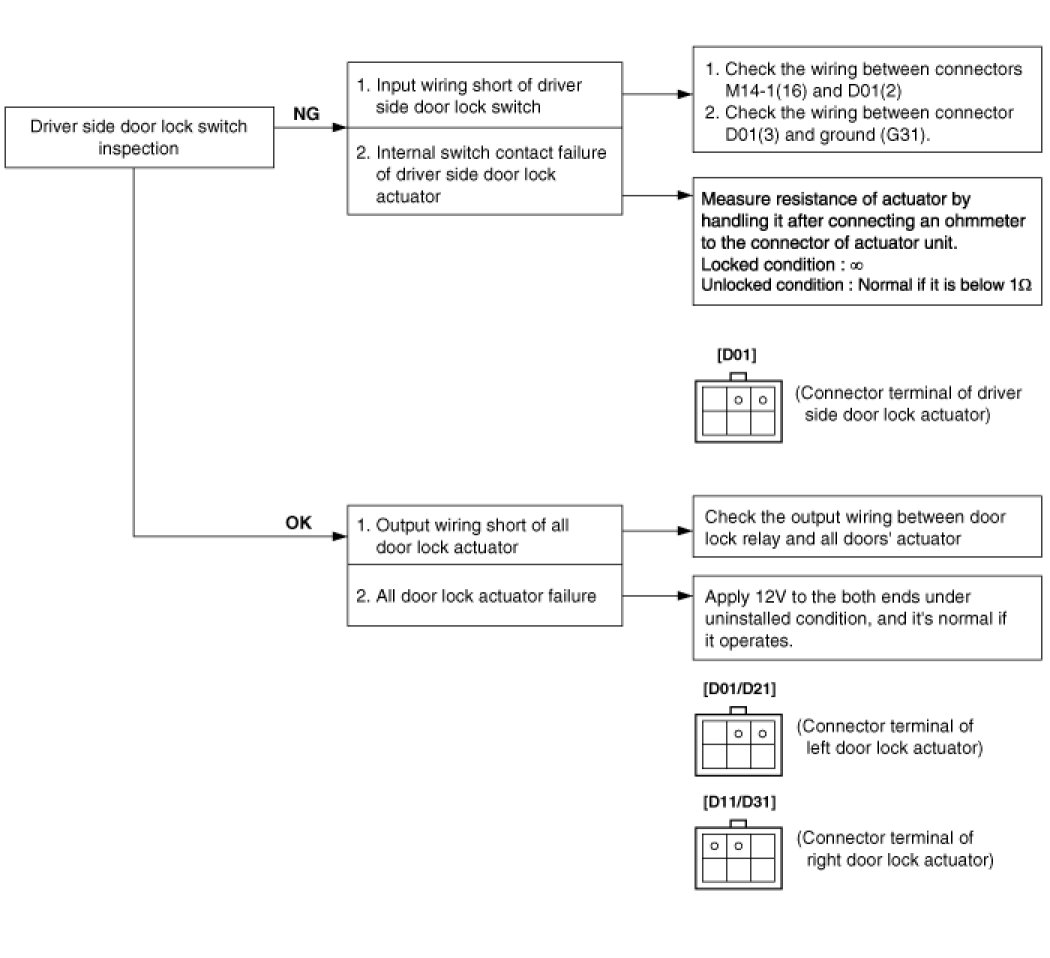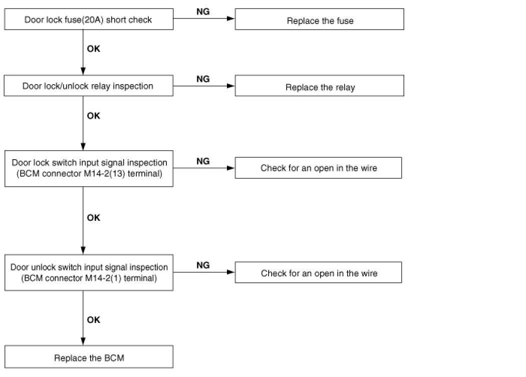 1. Lock function works but unlock function does not work. -> Since door unlock relay is malfunction, replace the door unlock relay.
