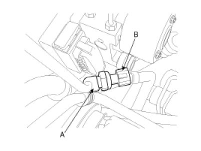 6. Remove the A/C pressure transducer (B) while holding on to the fitting block (A).