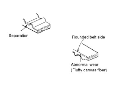 2. When the engine is overhauled or belt tension adjusted, check the belt carefully. If any of the following flaws are evident, replace the belt.