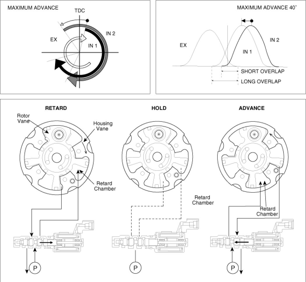 This CVVT system improves fuel efficiency and reduces NOx emissions at all levels of engine speed, vehicle speed, and engine load by EGR effect because of valve over-lap optimization.