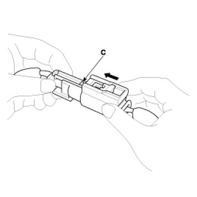1. To reconnect, hold the pawl-side connector half, and press on the back of the sleeve-side connector half in the direction shown. As the two connector halves are pressed together, the sleeve (A) is pushed back by the pawl (C). Do not touch the sleeve.