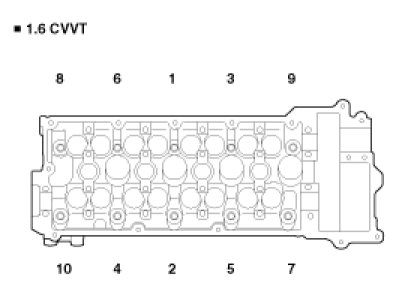 Using 8 mm and 10 mm hexagon wrench, install and tighten the 10 cylinder head bolts and plate washers, in several passes, in the sequence shown.