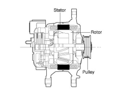 The generator is regulated by the battery voltage detection system. The main components of the generator are the rotor, stator, rectifier, capacitor brushes, bearings and V-ribbed belt pulley. The brush holder contains a built-in electronic voltage regulator.