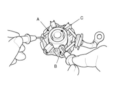 9. Check with an ohmmeter that no continuity exists between the commutator (A) and armature coil core (B), and between the commutator and armature shaft (C). If continuity exists, replace the armature.
