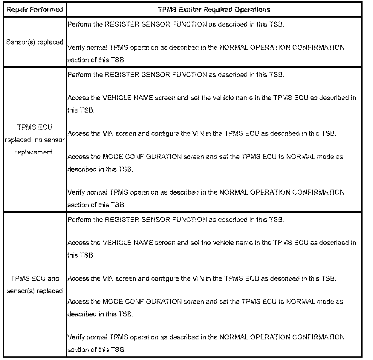 TPMS EXCITER REQUIRED OPERATIONS:Refer to the table above for TPMS Exciter operations that are required based upon the type of repair performed.