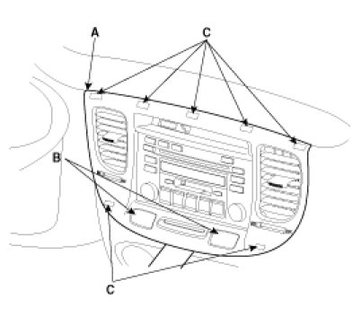 Remove the center facia upper panel (A). Avoid damaging retaining clip (C).