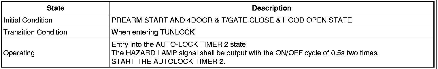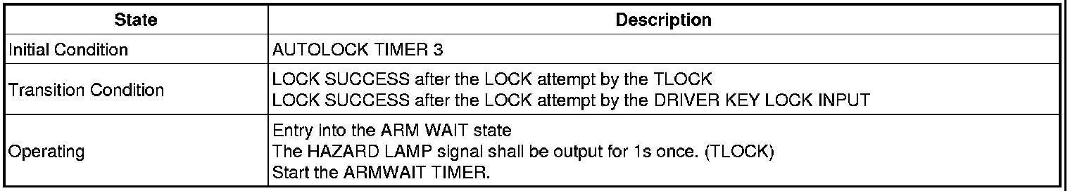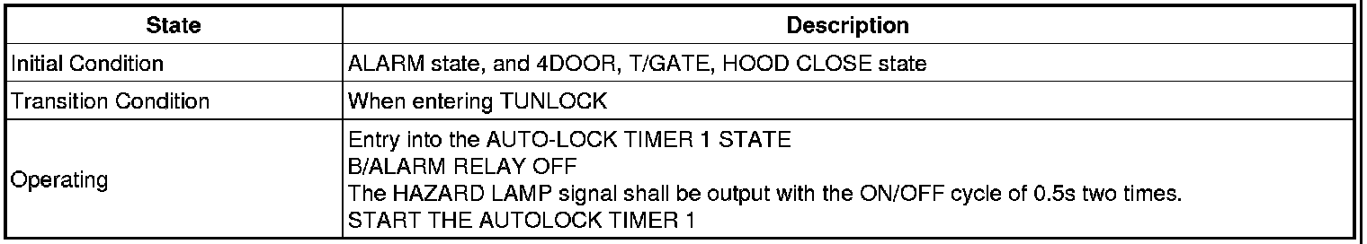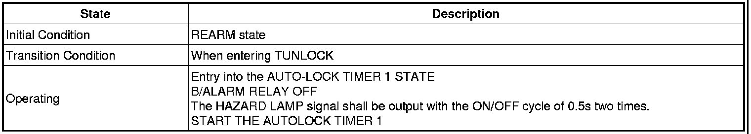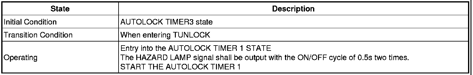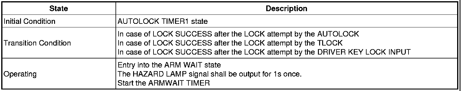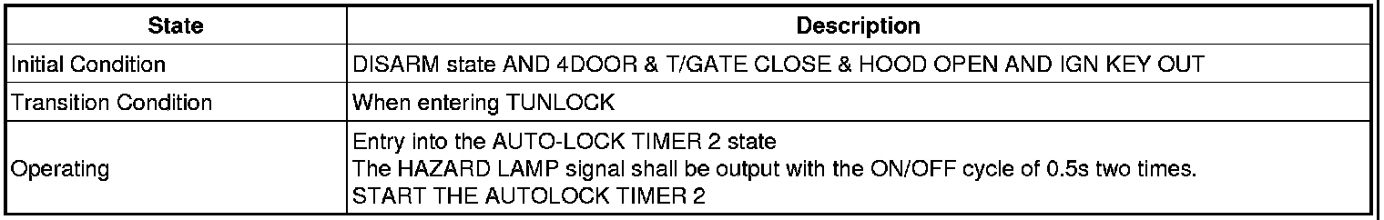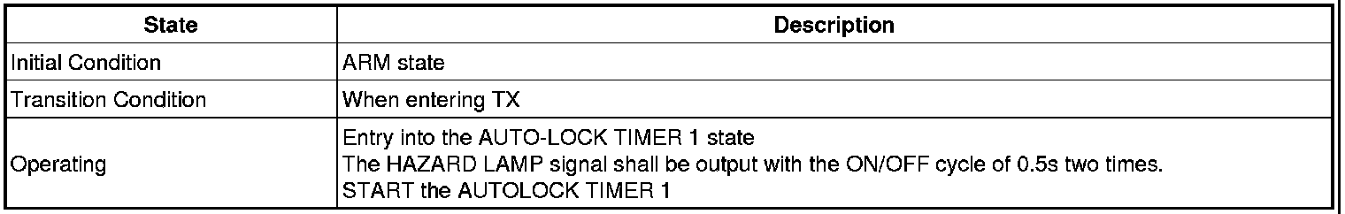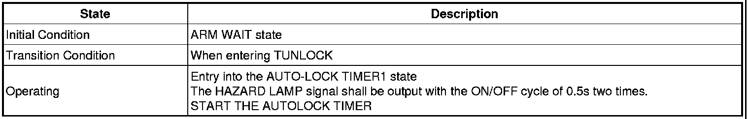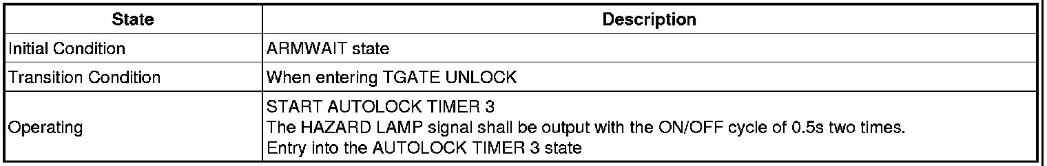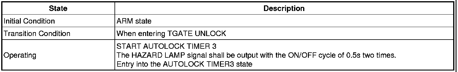 -> In state of ARM and ARMWAIT, When entering AUTOLOCK TIMER3 by T/GATE, if HAZARD LAMP output come into conflict with "T/GATE RELEASE FUNCTION", then HAZARD LAMP output control by T/GATE RELEASE function has priority