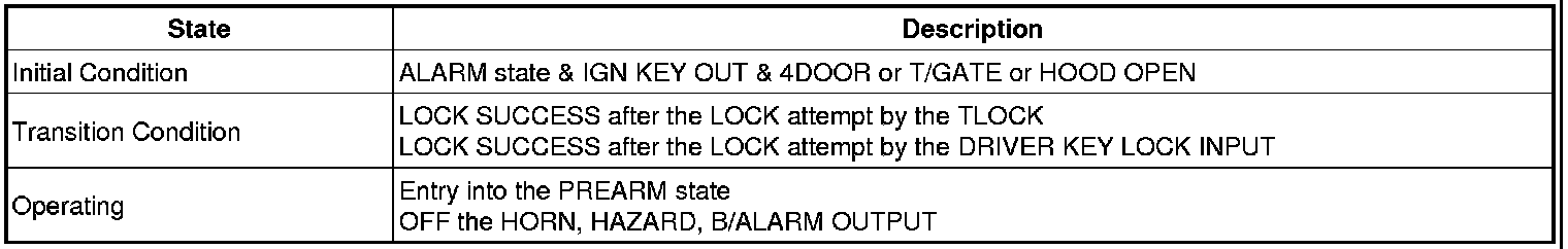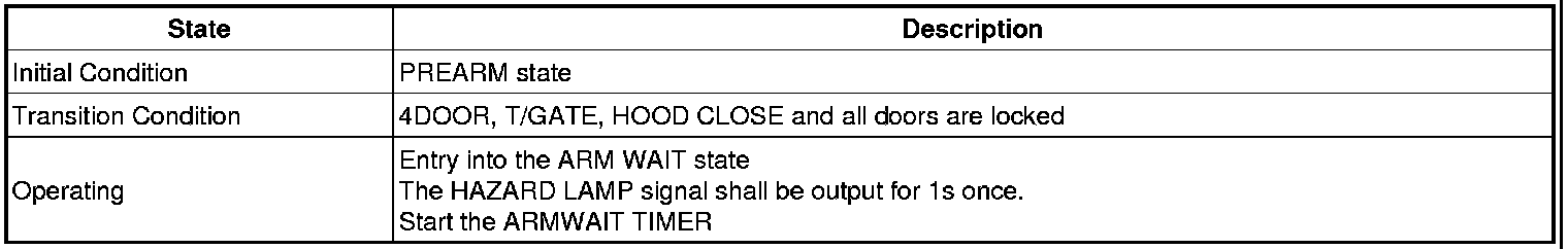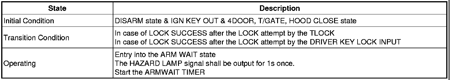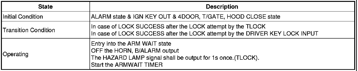 1. If the ARM WAIT state is maintained by the TX within 4s after entered into the ARM WAIT state by the TLOCK the HORN OUTPUT shall be gone side by side when the HAZARD alarm is operated.