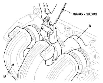 Using the SST(09495-3K000) clamp the stub manifold(A) and the inlet manifold(B) with the connection hose.