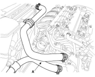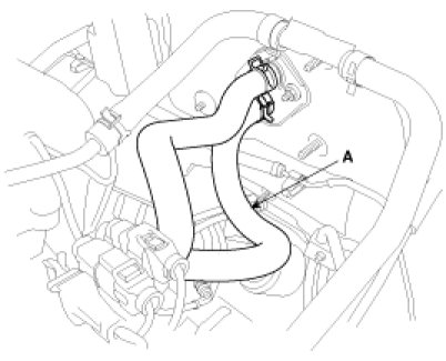 9. Remove the upper radiator hose and lower radiator hose(A).