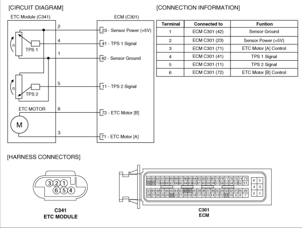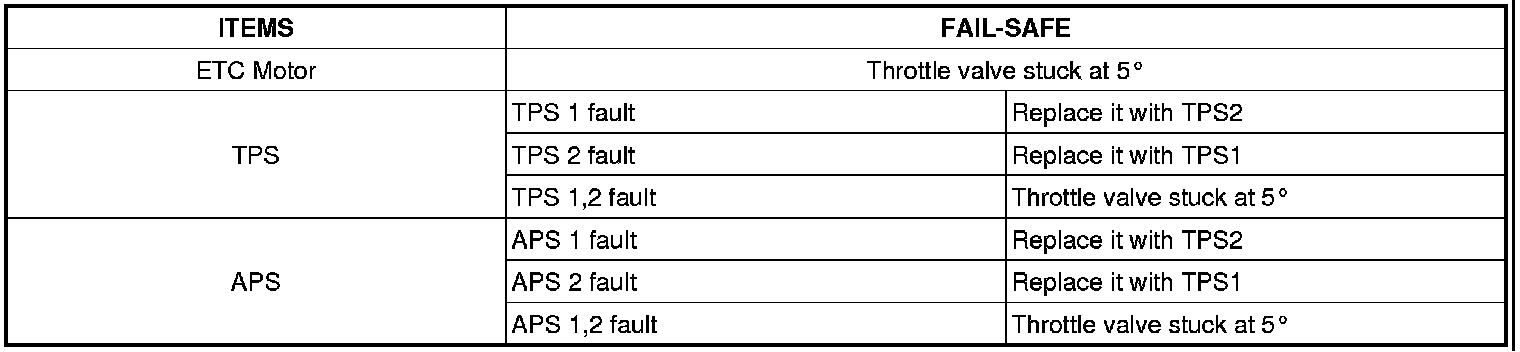 ETC (Electronic Throttle Control) system is electronically controlled throttle device which controls the throttle valve. It consists of ETC motor, throttle body and throttle position sensor (TPS). A mechanical throttle control system receives a driver's intention via a wire cable between the accelerator and the throttle valve, while this ETC system does the signal from the Accelerator Position Sensor (APS) installed on the accelerator pedal. After the PCM receives the APS signal and calculates the throttle opening angle, it activates the throttle valve by using the ETC motor. Additionally, it can materialize cruise control function without any special devices.