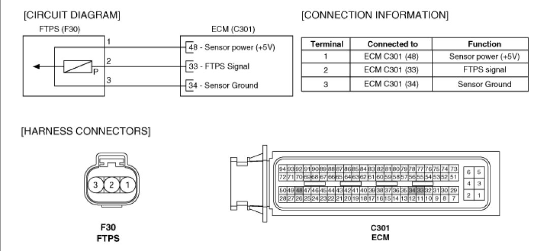 The evaporative emission control system prevents hydrocarbon vapors from escaping from the fuel tank into the atmosphere where they could form photochemical smog. Gasoline vapors are collected in the charcoal canister. The Fuel Tank Pressure Sensor (FTPS) is installed on fuel pump assembly and is an integral part of the evaporative monitoring system. The ECM monitors the FTPS signal to detect vacuum decay and excess vacuum. The FTPS measures the difference between the air pressure inside the fuel tank and atmospheric air pressure to check the purge control solenoid valve operation and for leak detection in the evaporative emission control system by monitoring pressure and vacuum levels in the fuel tank during the purge control solenoid valve operating cycles.