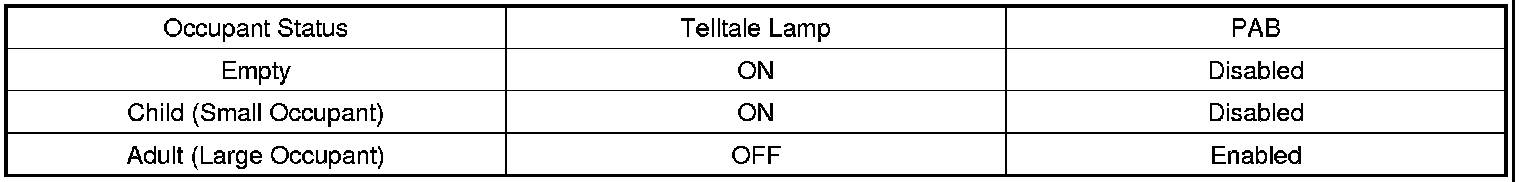 The Telltale Lamp indicates the Passenger Airbag(PAB) enabled and disabled status based on occupant status of passenger seat. If the passenger seat is empty or occupied with child (or child seat), the Passenger Airbag is disabled and the Telltale Lamp is turned ON to inform the driver that the PAB is disabled. As soon as operating voltage is applied to the SRSCM ignition input, the SRSCM activates telltale lamp prove out. OCS will send an defect status to the SRSCM as a default setting for passenger airbag deployment during the prove out period. Occupant status information and telltale status are as indicated below table.