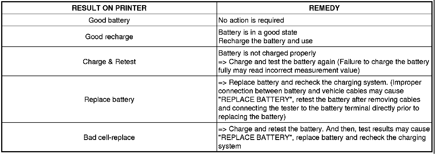 A relevant action must be given according to the test results by referring to the battery test results as shown in the table below.