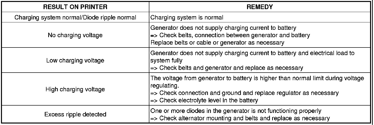 6. Take a relevant action according to the test results by referring to the table below after shutting off the engine and disconnect the tester clamps from the battery.
