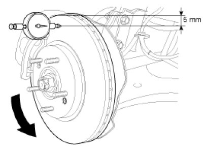 1. Place a dial gauge about 5mm (0.2 in) from the outer circumference of the brake disc, and measure the run out of the disc.