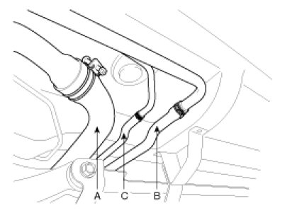 5. Disconnect the fuel filler hose (A), the leveling hose (B), and the vacuum hose (C).