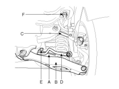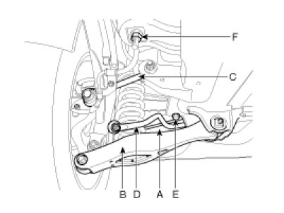 7. Remove the upper arm (A), the lower arm (B), the assist arm (C), and the stabilizer bar (D) from the fuel tank & suspension member assembly.