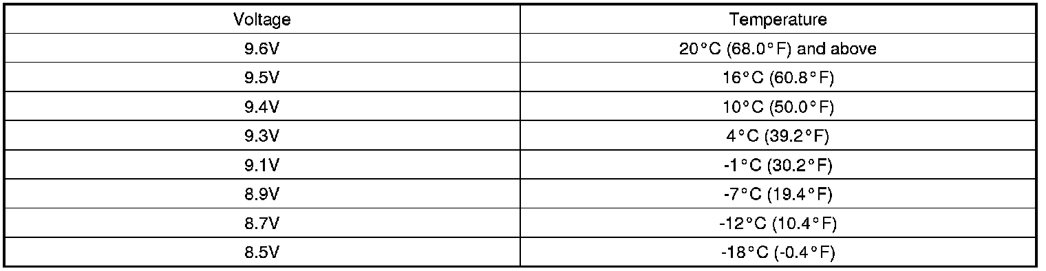 (5) Compare the voltage reading with the minimum and replace the battery if battery test voltage is below that shown in the voltage table.