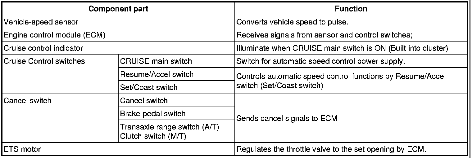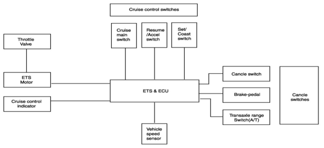 The main components of cruise control system are mode control switches, transaxle range switch, brake switch, vehicle speed sensor, ECM and ETS motor that connect throttle body.