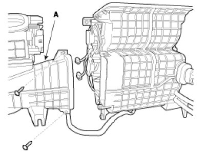 5. Remove the blower unit (A) from the heater unit after loosening a mounting bolt and 2 screws.