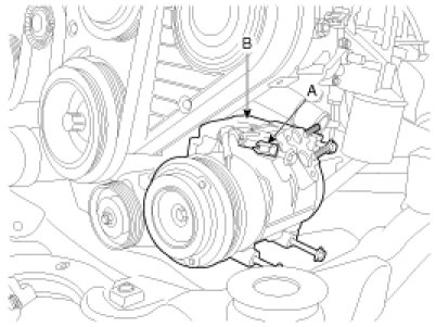 5. Remove the bolts, then disconnect the suction line (A) and discharge line (B) from the compressor. Plug or cap the lines immediately after disconnecting them to avoid moisture and dust contamination.