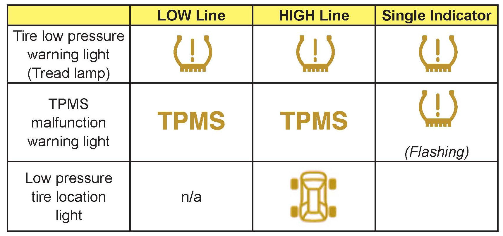 1. If the tire low pressure warning light (tread lamp) illuminates on a Low Line system inspect the pressure of all four tires. The tires may have been rotated after the sensors were registered.