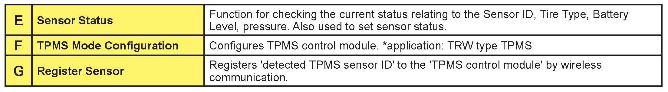 When the TPMS control module or the TPMS sensor is replaced, the TPMS sensor ID could be registered using this function for the TPMS system to operate properly.