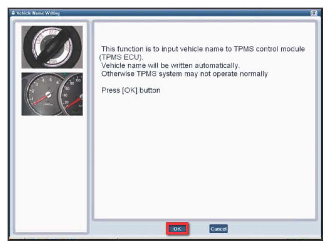 2. The Vehicle Name can be verified on this page The vehicle name next to Read is the name recorded in the TPMS Control Module. The vehicle name listed in the lower left of the text box is the name that should be entered Whether or not the names match press OK. If the Read vehicle name did not already register the correct name it will after pressing OK.