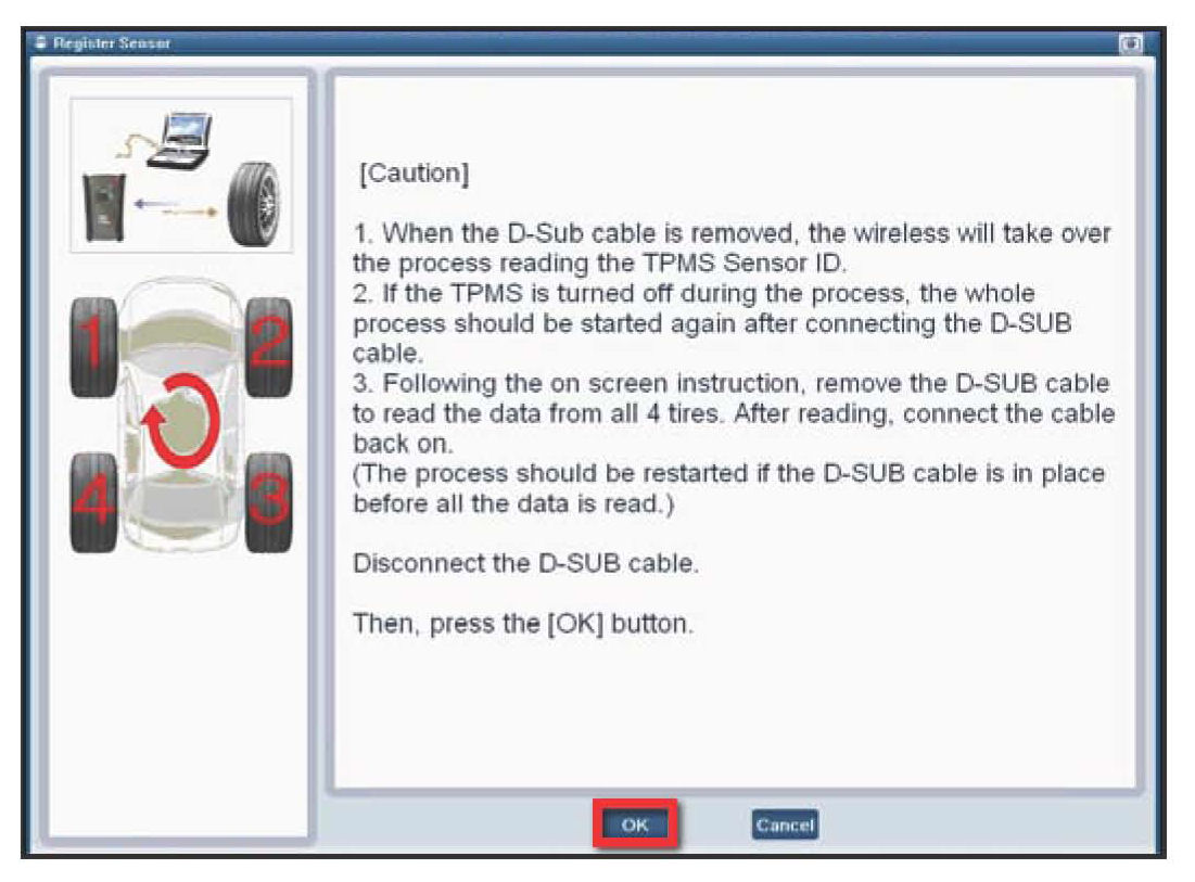 If power to the TPMS module is lost during this operation, reconnect the D-SUB cable and recharge the GDS TPMS module.