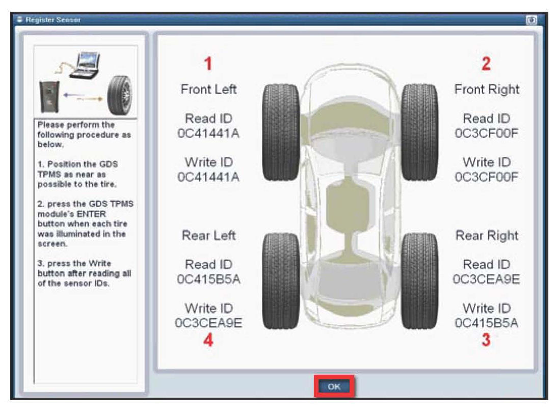 The TPMS Sensor ID can be registered automatically (using the GDS TPMS module) by going to "Register Sensor" function under "Data Treatment."