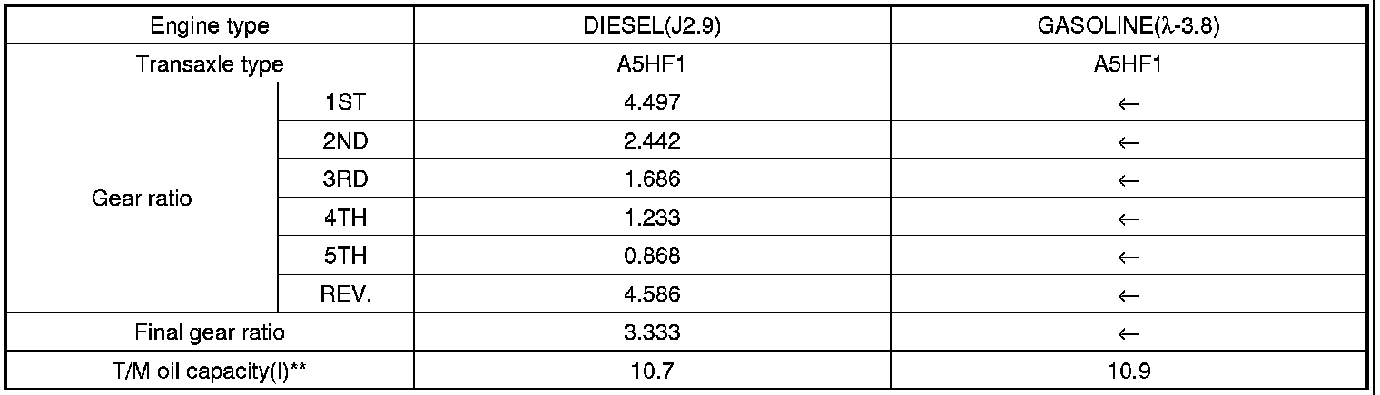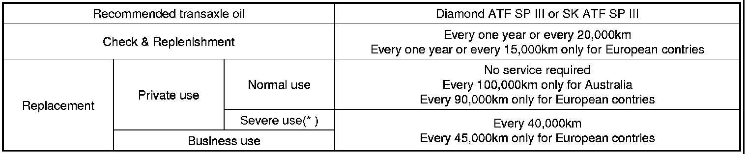 ** The quantity in the chart above is for the reference. The actual filling quantity of the automatic transaxle fluid must be set according to 'INSPECTION' or 'REPLACEMENT' procedure of the automatic transaxle fluid.